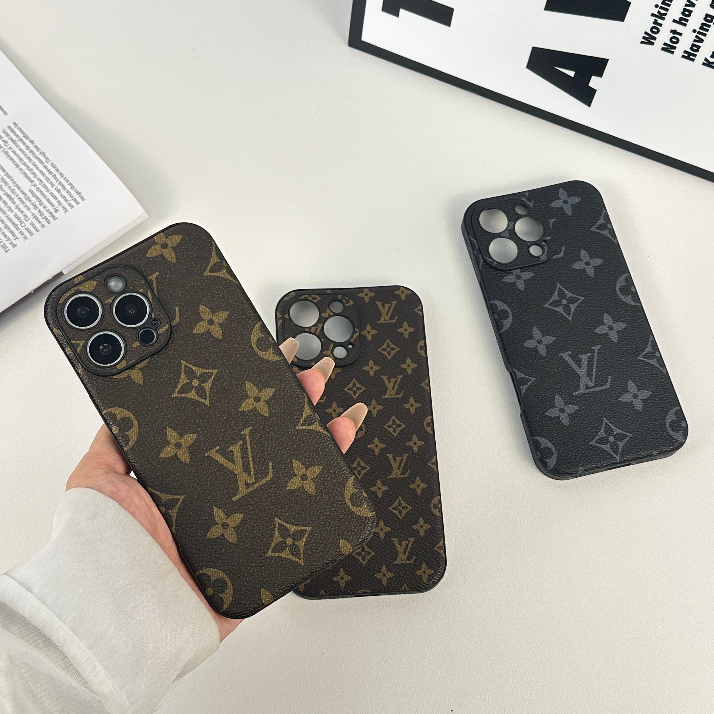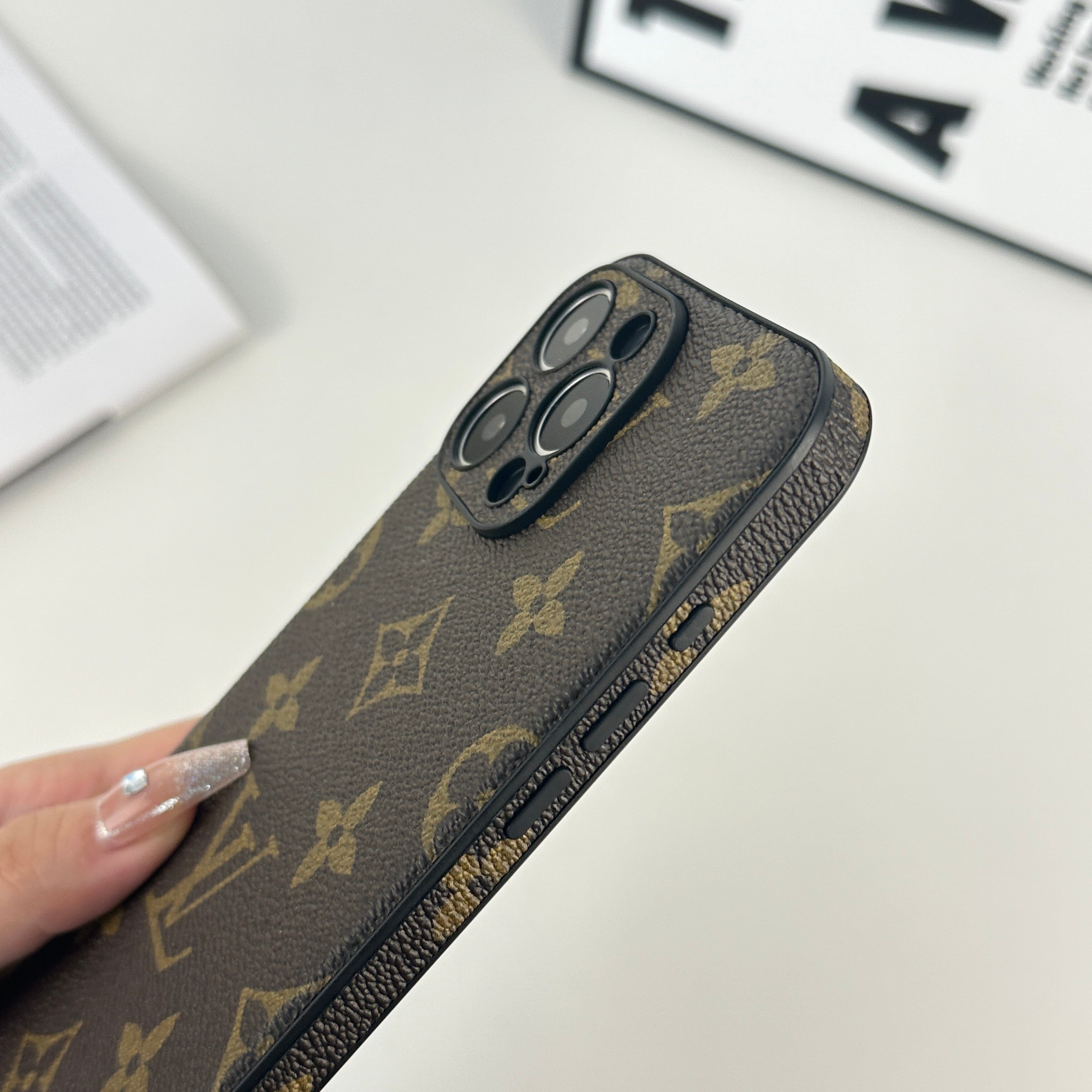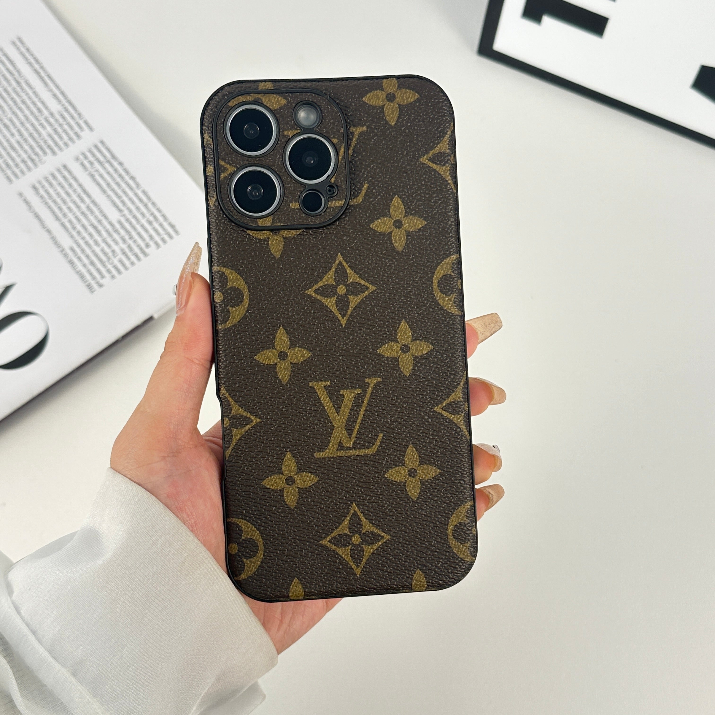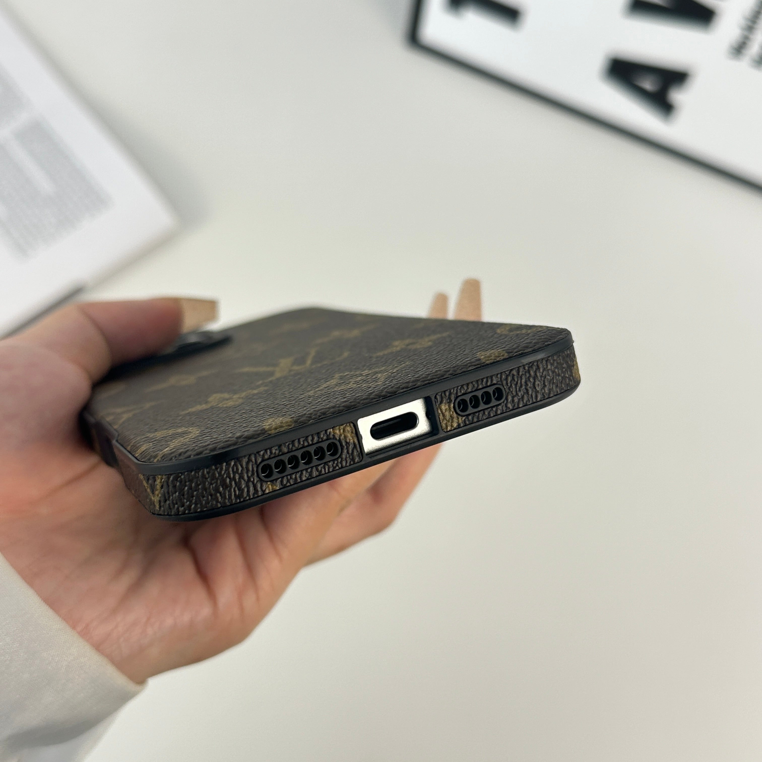 ラグジュアリーなモノグラム大柄: 存在感のある印刷で高級感を演出。